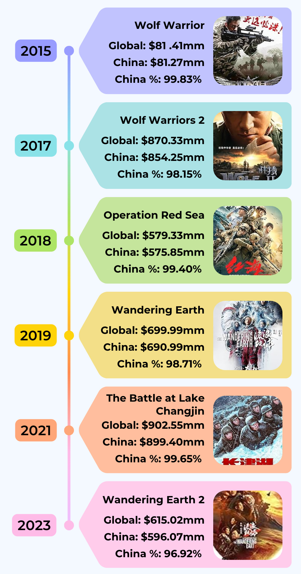While Chinese films have scored major box office wins, the vast majority of the revenue came from the local China audience alone. 96% is the lowest number, that’s crazy localized!